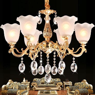 Cuối cộng là mẫu đèn chùm tiên tiến này được bề ngoài sang trọng đẳng cấp, độc đáo. Sản phẩm là sự kết hợp hài hòa giữa hợp chất kẽm, thủy tinh và pha lê. mang các đường nét hoa văn được cham khắc tinh xảo cộng những chao đèn thuỷ tinh mẫu mã tựa như những bông hoa đang khoe sắc. Tạo nên một tổng thể hài hoà, tạo điểm nhấn cho dung tích mà nó hiện hữu.
