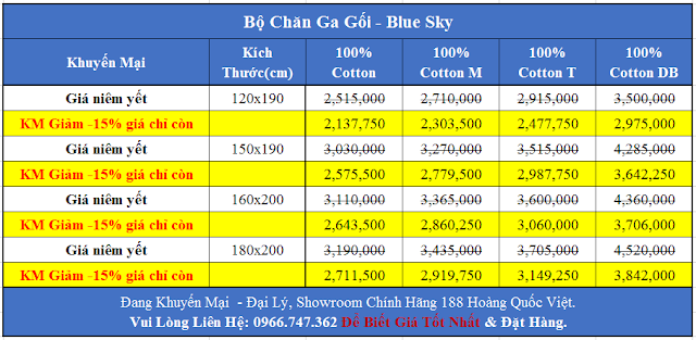dòng chăn ga gối đệm Blue Sky của Hanvico mang đa phong biện pháp, đa kích cỡ , hợp với mọi không gian của nhiều chủng loại hộ gia đình , mà giá chăn ga gối đệm Blue Sky lại song hành tuy nhiên với chất lường của mặt hàng hàng triệu. “Sản phẩm rẻ , thực tế chất lượng không hề rẻ”. Mọi người Có thể tham khảo giá của mặt hàng tại đây.